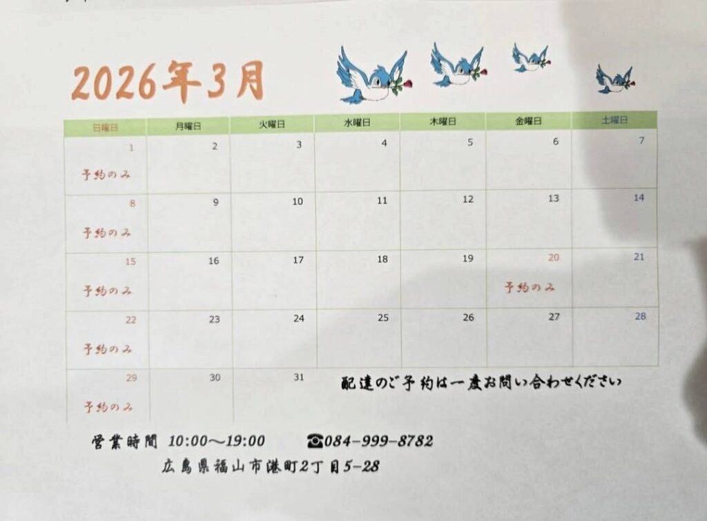 ブログ 3月の営業のお知らせ 2026.02.16 Tweet Share Hatena Pocket RSS feedly Pin it この記事のタイトルとURLをコピーする 3月は卒業式、送別シーズンとなりますので、日曜日も事前ご予約のみお受けしております ※当日予約はお受けしておりません。 お早めにご予約お願いします 配達は枠が混雑が予想されますので、1度お問い合わせお願いします Tweet Share Hatena Pocket RSS feedly Pin it この記事のタイトルとURLをコピーする 2月営業お知らせ🌸 前の記事